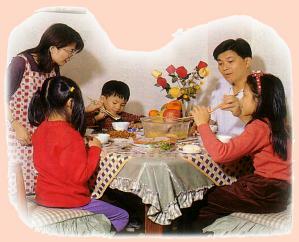 今朝父母多半是上班族,只要晚餐才有機會與家人團聚,共享天倫之樂,促進家人之溝通及親情,飯前如能禱告以感恩之心用餐。寧馨及和諧氣氛可助食慾,並促進食物之消化及接收。期盼小孩能跟隨父母之身教用餐而不偏食。