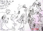 这是我们艺术体验团中一个叫远远的小女孩的画,就象她妈妈说的:“只喜爱画她的小娃娃,扎着小辫,穿着短裙,和小动物们在戏耍。”和很多小朋友一样,这是个典范的还在自我世界中畅游的孩子,小娃娃是自我的一种图示符号。看画面右下角的埃及方尖碑,和个中的象形文字,还有左上角简单的表达,阐明她天真的自我已经在和外界作着情绪的交流,画中的线条和构图都在释放着无忌的情绪和性情。 www.bbcms.net转载自网络